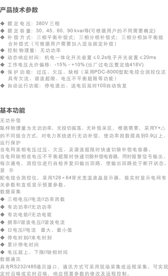 本系列產品采用微處理器為控制核心,對系統無功進行自動跟蹤監測;控制器以無功功率為控制物理量,對電容投切執行元件進行全自動控制,響應及時迅速,補償效果好,工作可靠,杜絕了危害電網的過補償現象和電容器投切時的沖擊、擾動現象。智能低壓線路無功自動補償裝置,按負荷性質進行設計,可使系統功率因數由0.65左右,提高到0.9以上,使變壓器和線路的輸電能力提高15~30%以上,可降低線路損耗25~50%,達到了穩定電壓,提高電能質量,降低供用電費用的良好效果。