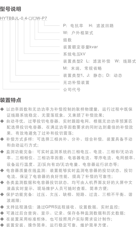 HYTBB低壓無功綜合補(bǔ)償裝置適用于配變、低壓線路,或其他的戶外低壓配電系統(tǒng)場合,實(shí)現(xiàn)無功自動(dòng)跟蹤補(bǔ)償。裝置集無功補(bǔ)償優(yōu)化和電力監(jiān)測于一體,采用固定補(bǔ)償和動(dòng)態(tài)補(bǔ)償相結(jié)合方式。可實(shí)時(shí)跟蹤電網(wǎng)的運(yùn)行狀態(tài),具有平滑的補(bǔ)償性能,具有最優(yōu)的補(bǔ)償效果。系統(tǒng)可有效補(bǔ)償線路無功功率,保證功率因數(shù)穩(wěn)定,降低線路損耗,提高變壓器、傳輸線路的利用率,提高負(fù)載端的供電質(zhì)量。