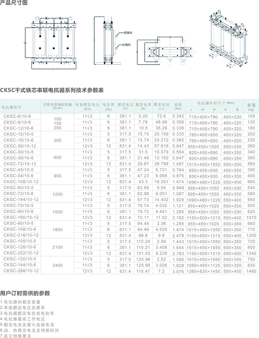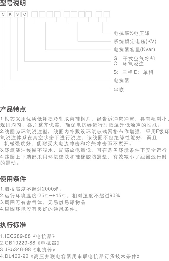 CKSC型鐵芯高壓電抗器主要用于6KV~10KV電力系統與高壓電容器 組串聯,能夠有效的抑制和吸收高次諧波,限制合閘涌流及操作過電壓, 保護電容器組,改善系統的電壓波形,提高電網功率因數。