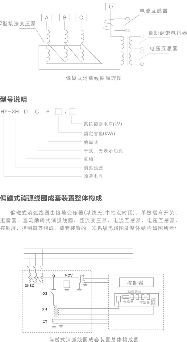 偏磁式消弧線圈是采用在交流線圈內布置一個磁化鐵芯段,通過施加 直流勵磁電流改變鐵心的磁導,從而實現電感的連續可調。當電網發生單 相接地故障時,由控制器瞬間調整電感,補償接地電容電流。 該成套裝置主要優點:電控無級連續、靜態可調,及電網正常運行時不 干擾電網運行。缺點則是相對干預調節形式的消弧線圈補償響應速度慢。