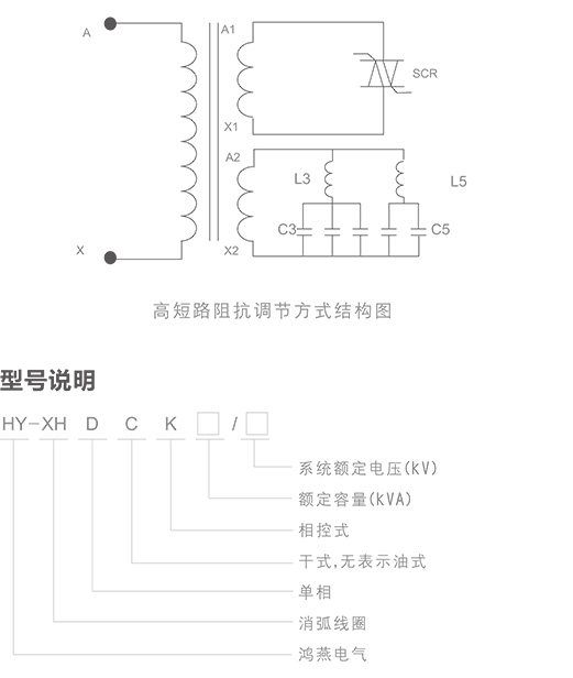 相控式消弧線圈也稱”高短路阻抗式”, 即成套裝置中消弧 線圈的一次繞組作為工作繞組接人配電網中性點,二次繞組作為控 制繞組由2個反向連接的晶閘管短路,通過調節晶閘管的導通角來 調節二次繞組中的短路電流,從而實現電抗值的可控調節。調節可 控硅的導通角由0~ 180度之間變化,使可控硅的等效阻抗在無窮 大至零之間變化,輸出的補償電流就可在零至額定值之間得到連續 無極調節。